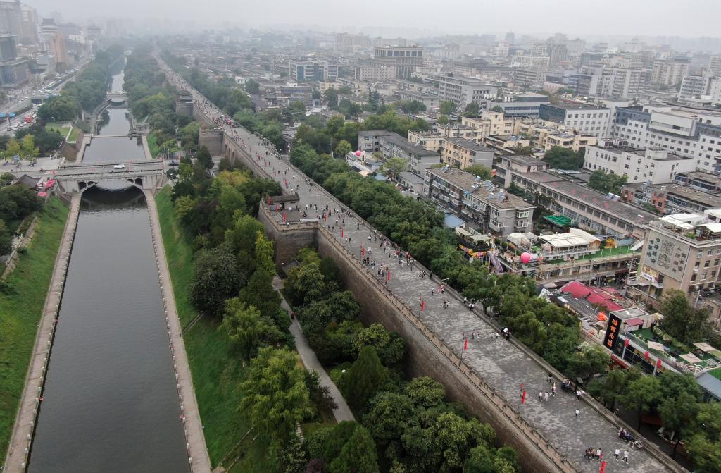 10月3日,游客在西安城墙景区参观(无人机照片)。新华社记者李一博摄